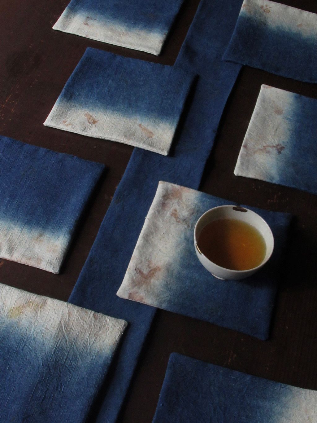 以古老的絹布進行藍染與茶染而成。