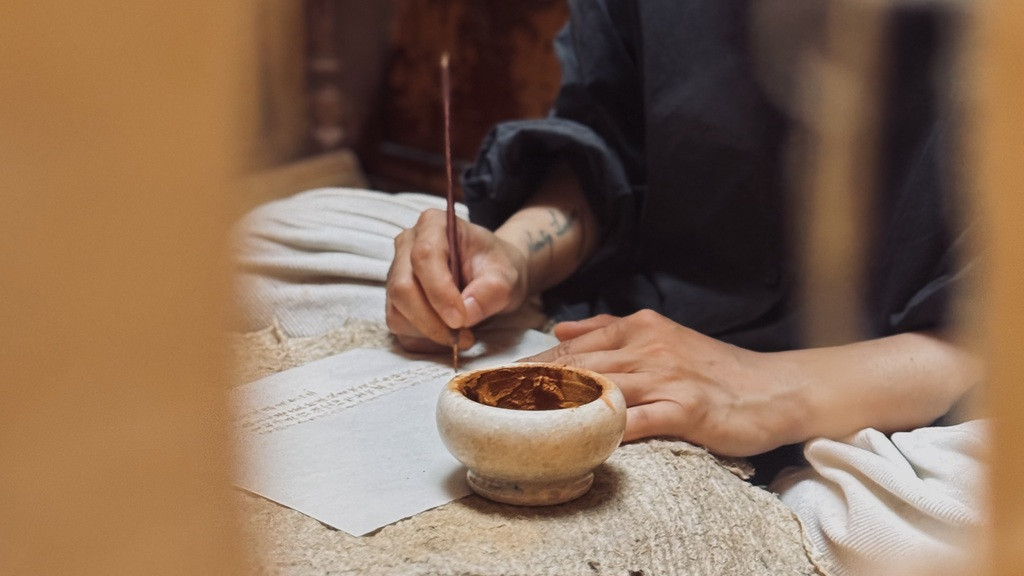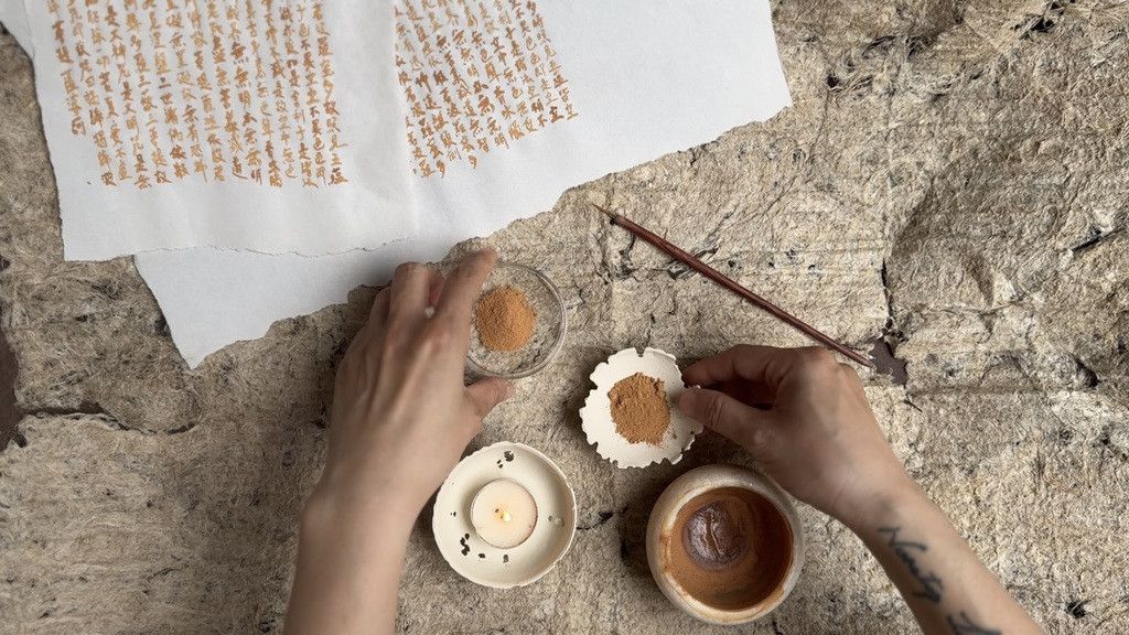 在工作坊中,你會以紅土為墨,慢慢抄寫一段經文。