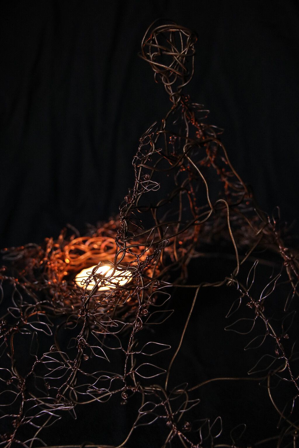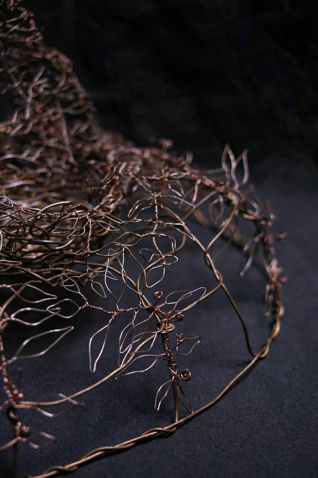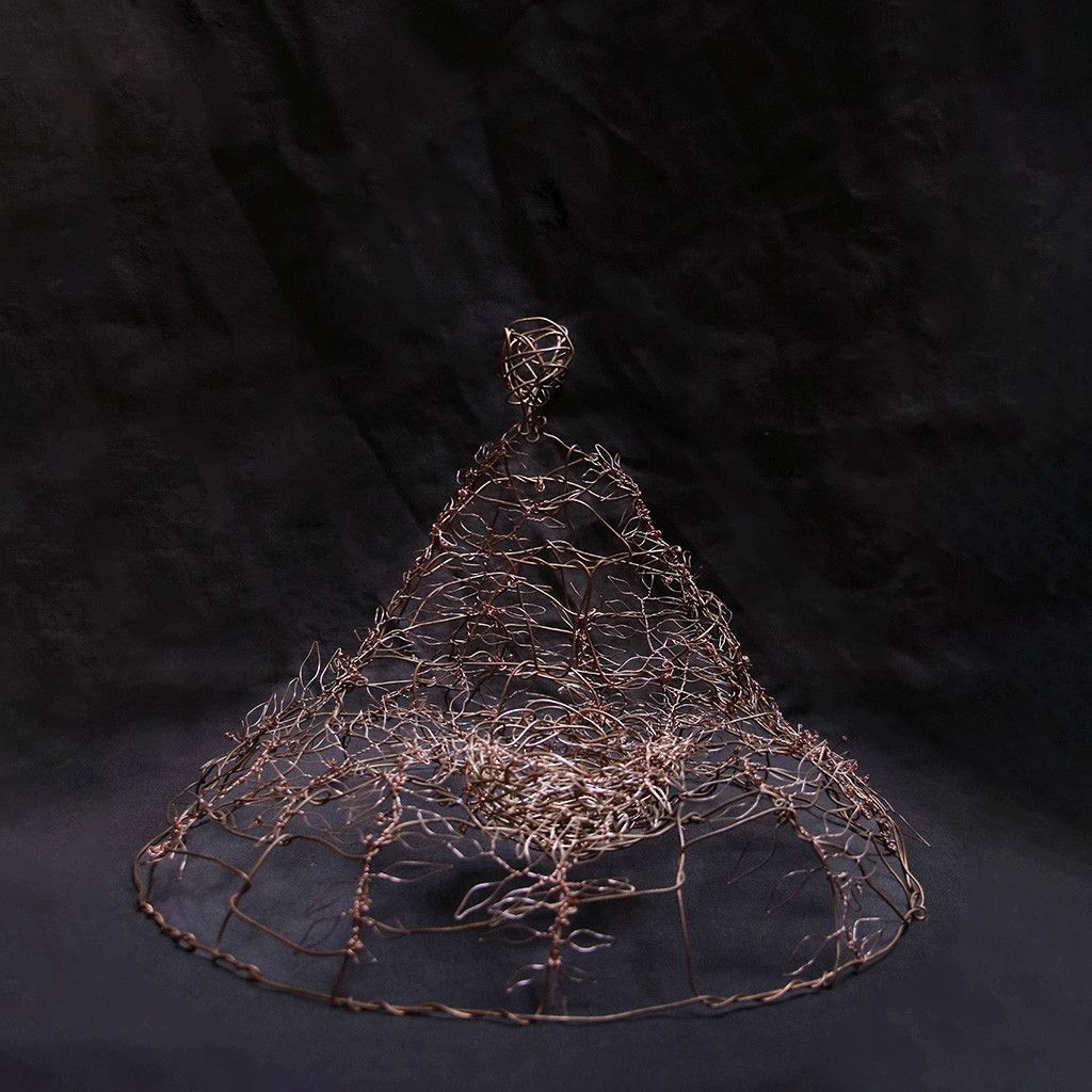 編織雕塑所用的材質以金屬線為主,原因是它既堅韌又柔軟,具有可塑性與流動感,(很契合修行上所需具備的條件)也會取用生活周遭可再利用之物例如紙,棉麻線材,布料,植物纖維等…..交織架構出體察內在的心得之作。