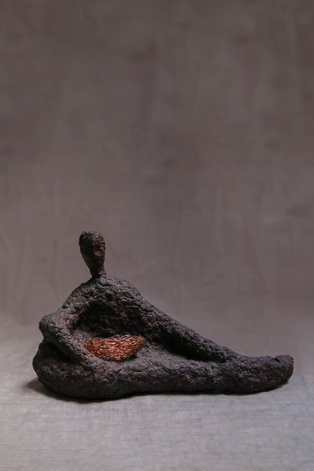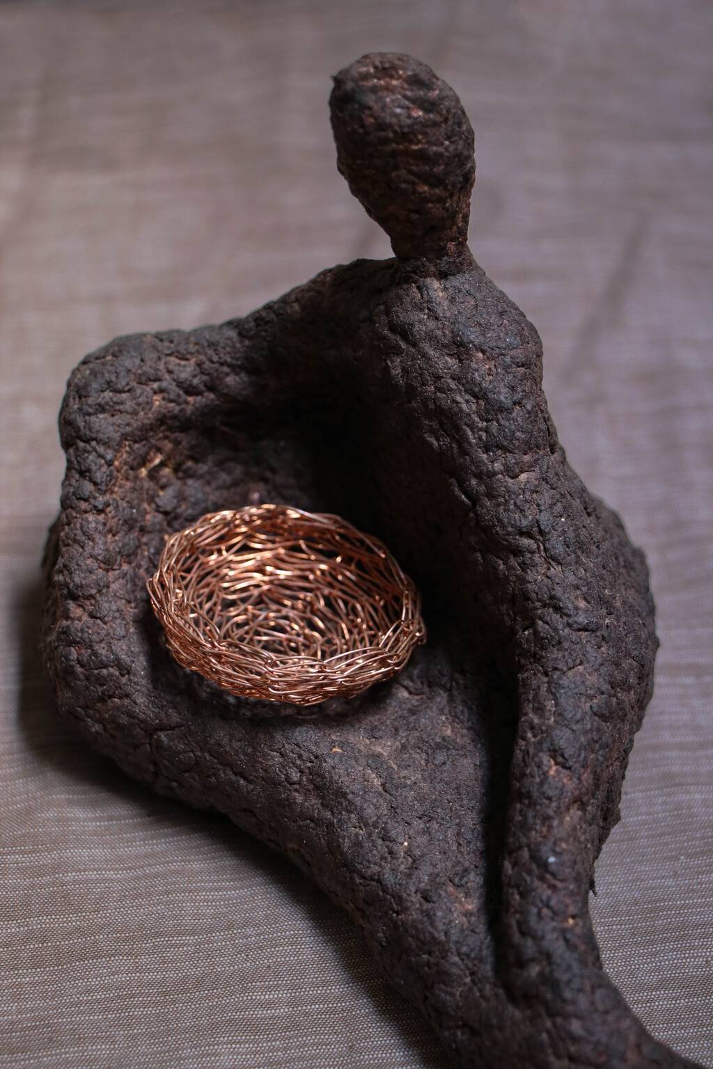 編織雕塑所用的材質以金屬線為主,原因是它既堅韌又柔軟,具有可塑性與流動感,(很契合修行上所需具備的條件)也會取用生活周遭可再利用之物例如紙,棉麻線材,布料,植物纖維等…..交織架構出體察內在的心得之作。