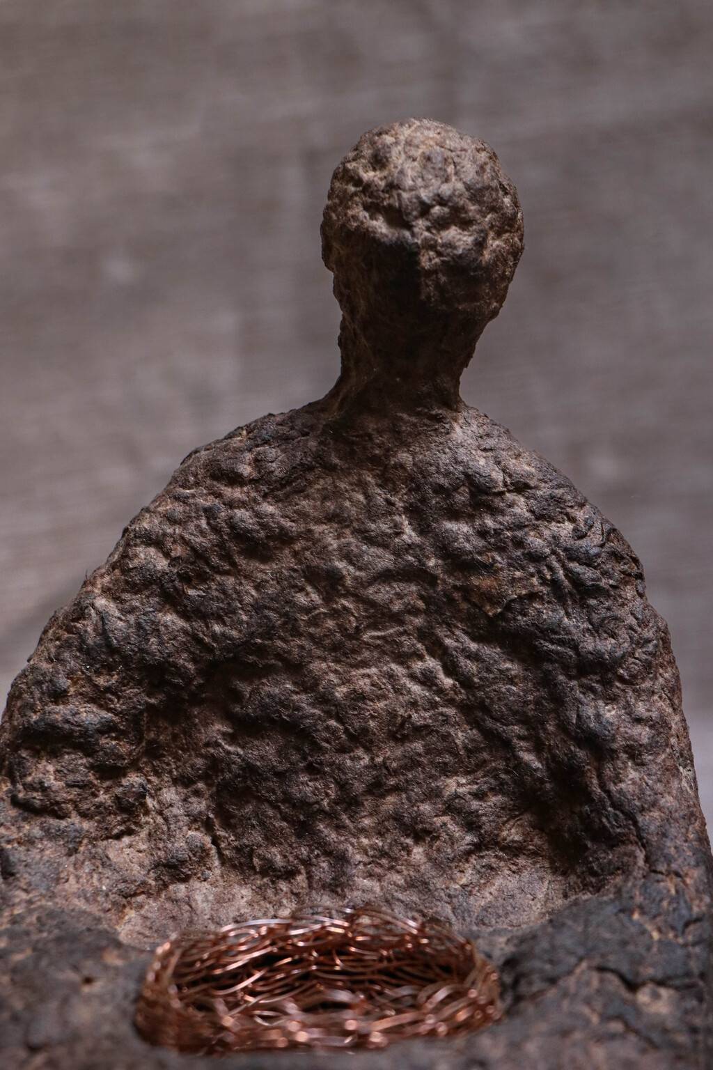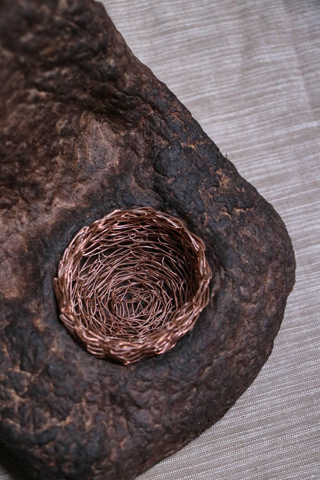 編織雕塑所用的材質以金屬線為主,原因是它既堅韌又柔軟,具有可塑性與流動感,(很契合修行上所需具備的條件)也會取用生活周遭可再利用之物例如紙,棉麻線材,布料,植物纖維等…..交織架構出體察內在的心得之作。