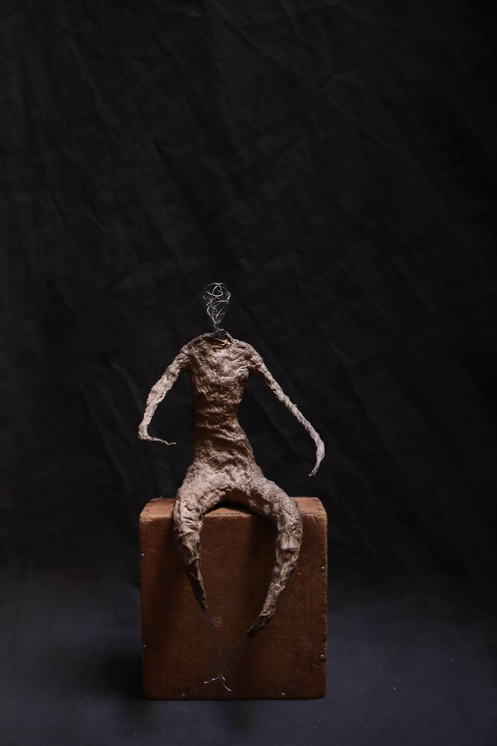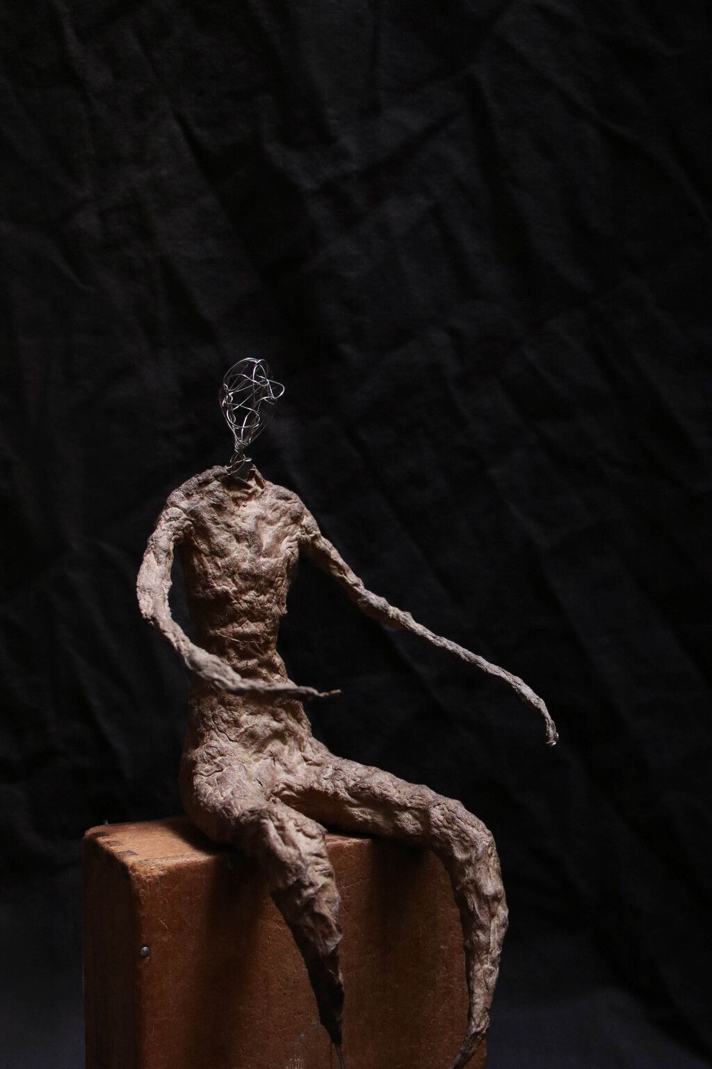 編織雕塑所用的材質以金屬線為主,原因是它既堅韌又柔軟,具有可塑性與流動感,(很契合修行上所需具備的條件)也會取用生活周遭可再利用之物例如紙,棉麻線材,布料,植物纖維等…..交織架構出體察內在的心得之作。