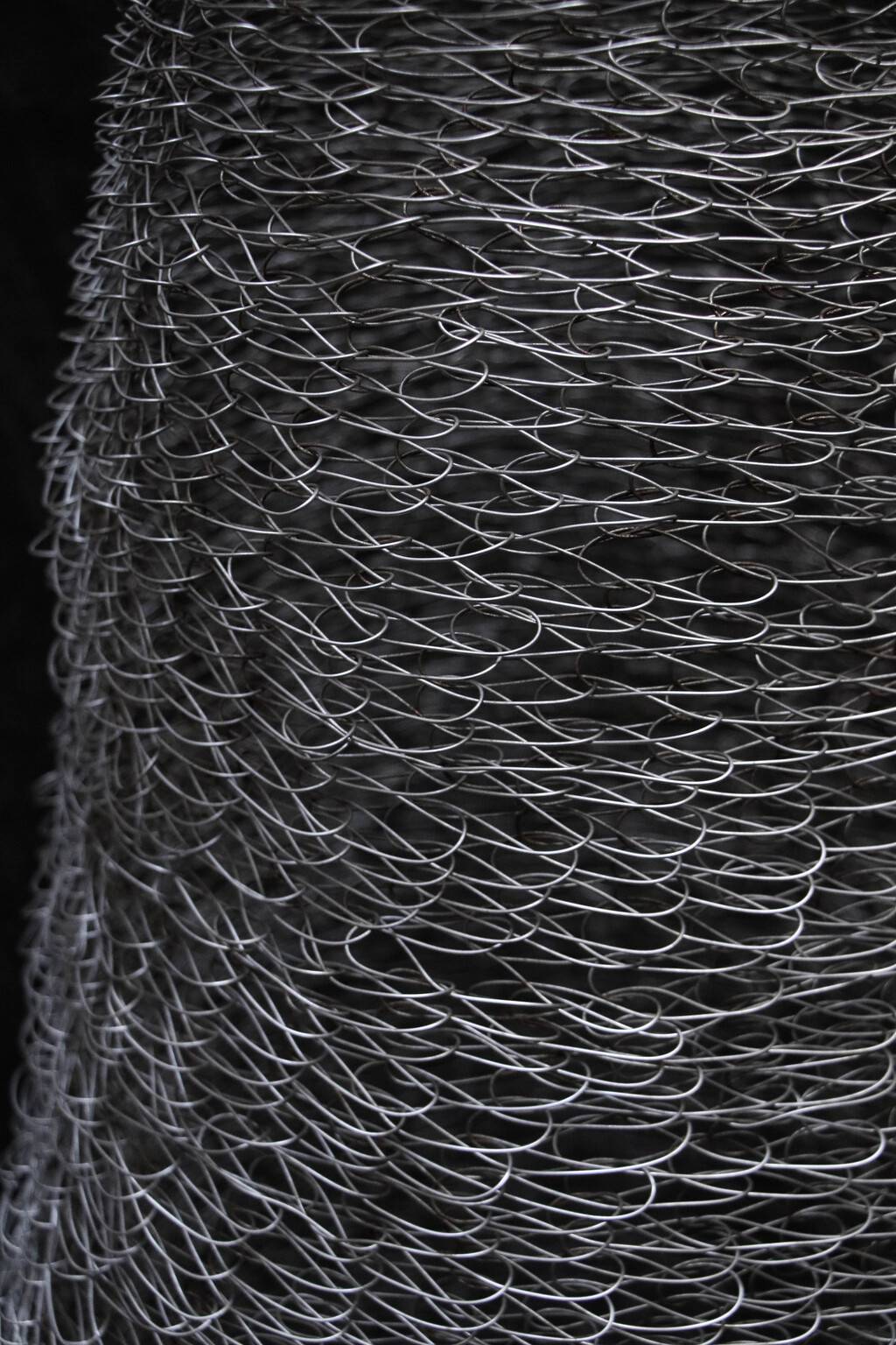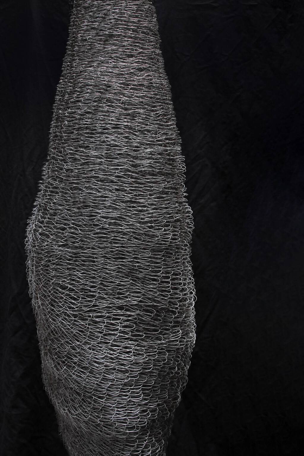 編織雕塑所用的材質以金屬線為主,原因是它既堅韌又柔軟,具有可塑性與流動感,(很契合修行上所需具備的條件)也會取用生活周遭可再利用之物例如紙,棉麻線材,布料,植物纖維等…..交織架構出體察內在的心得之作。