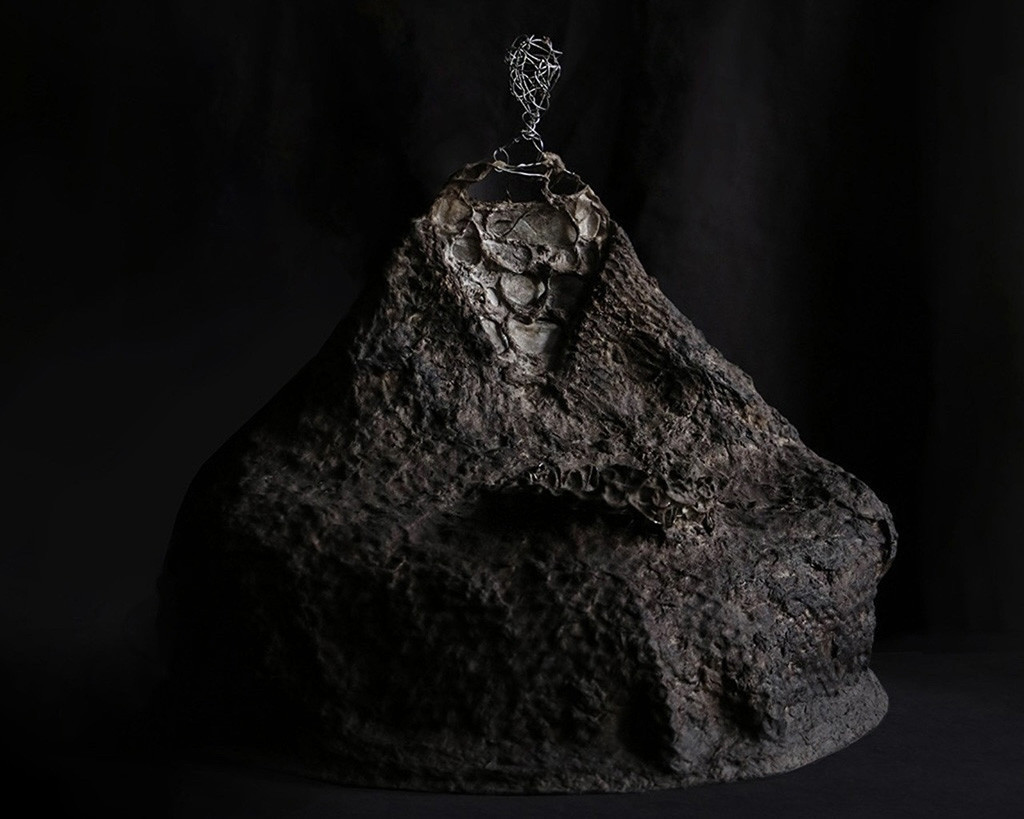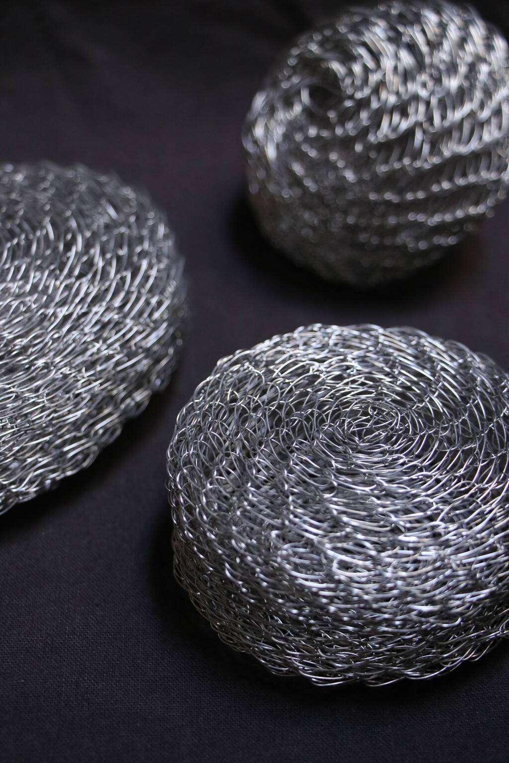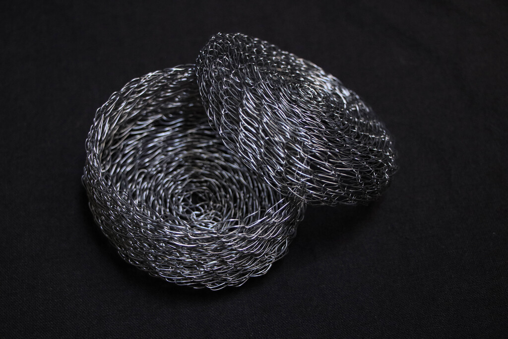 編織雕塑所用的材質以金屬線為主,原因是它既堅韌又柔軟,具有可塑性與流動感,(很契合修行上所需具備的條件)也會取用生活周遭可再利用之物例如紙,棉麻線材,布料,植物纖維等…..交織架構出體察內在的心得之作。