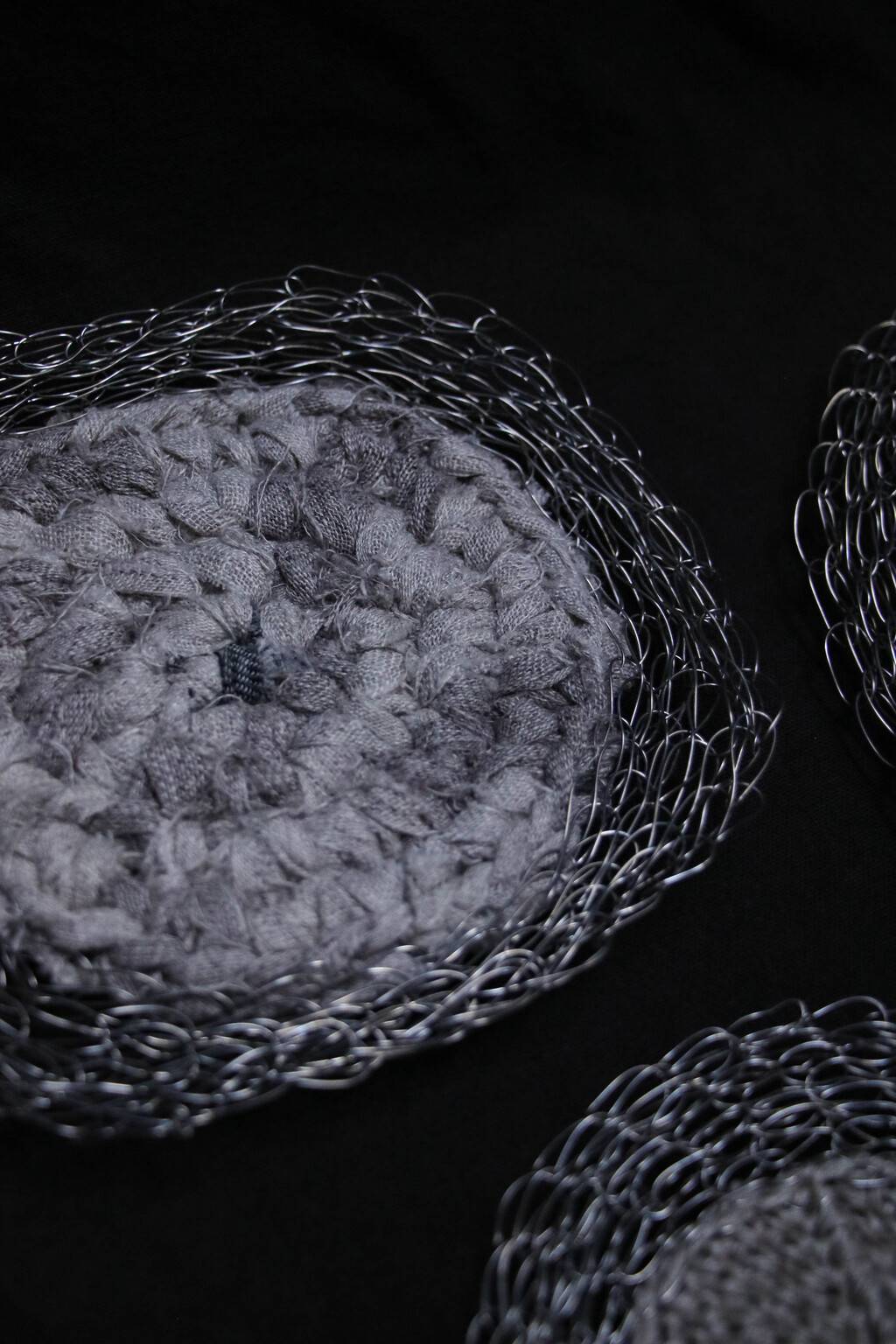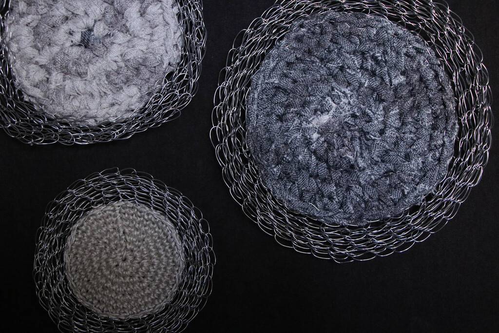 編織雕塑所用的材質以金屬線為主,原因是它既堅韌又柔軟,具有可塑性與流動感,(很契合修行上所需具備的條件)也會取用生活周遭可再利用之物例如紙,棉麻線材,布料,植物纖維等…..交織架構出體察內在的心得之作。