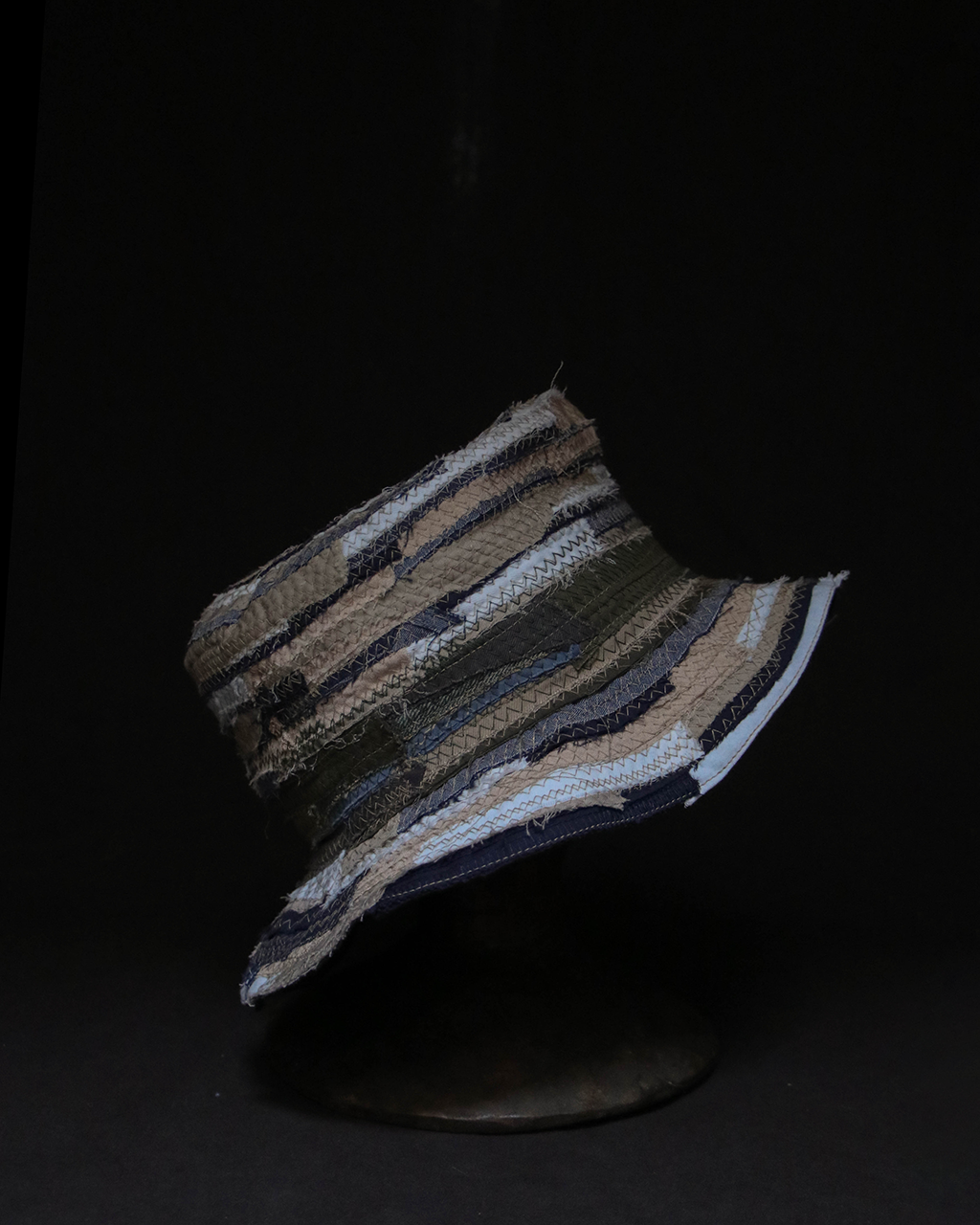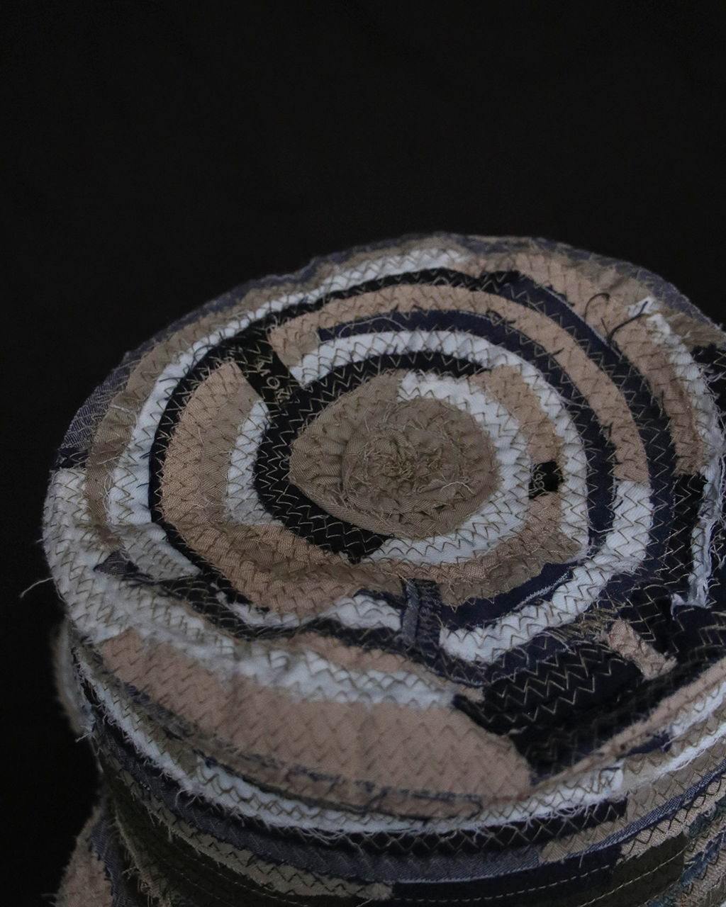 以回收舊衣拆解後的布邊為材料,結合手拉胚概念,創作出如布製陶器般的立體作品,重新賦予廢棄布料新生命。