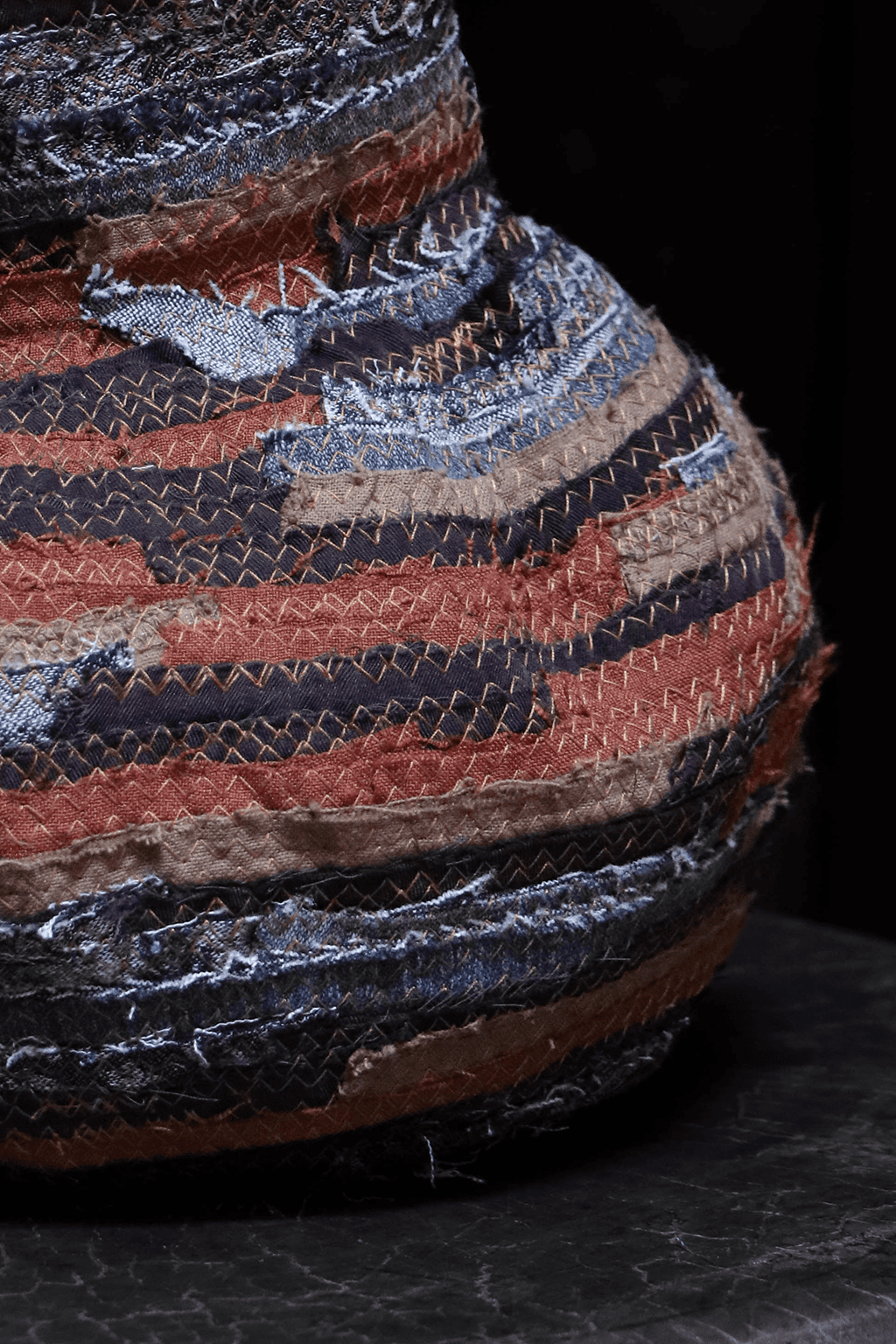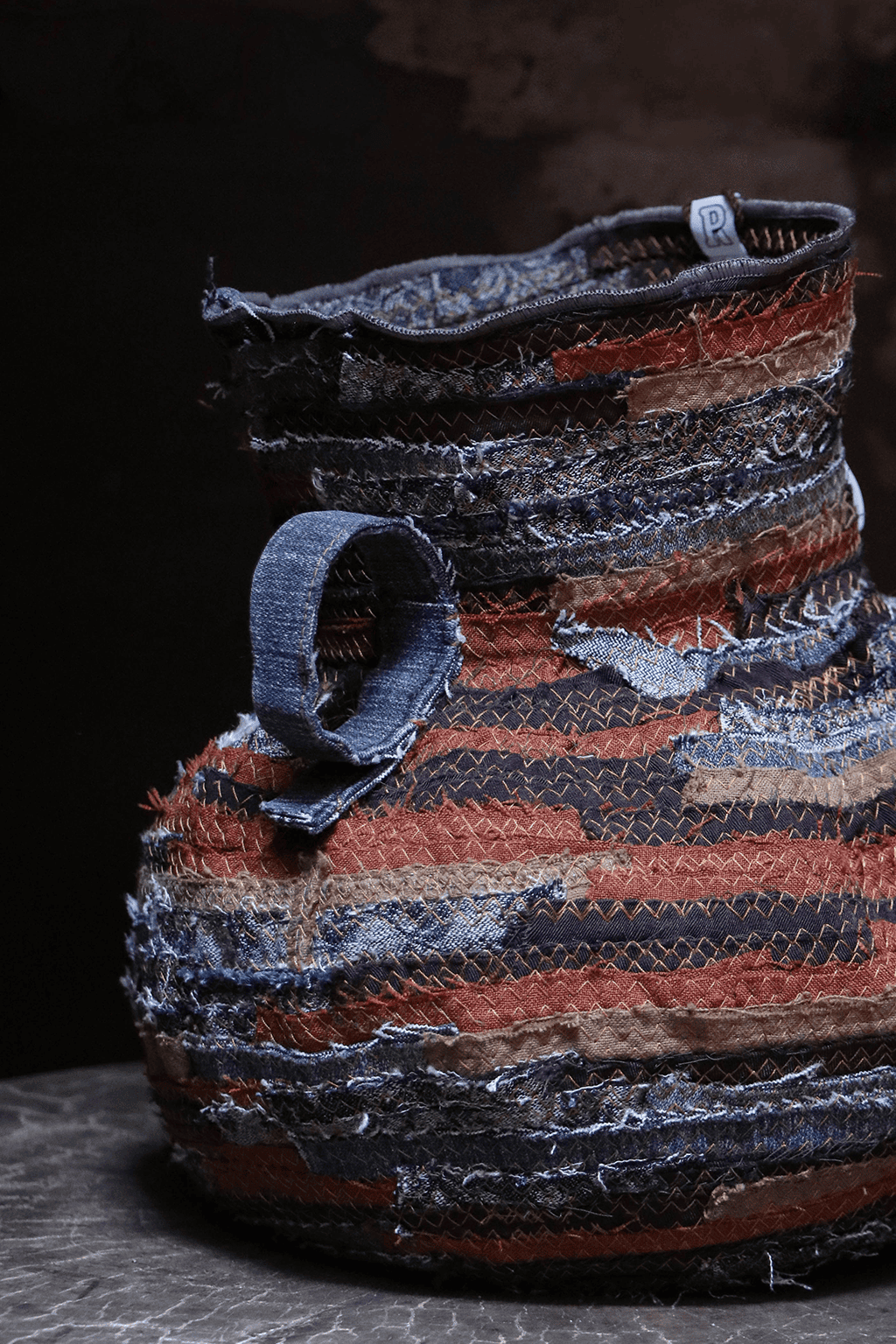 以回收舊衣拆解後的布邊為材料,結合手拉胚概念,創作出如布製陶器般的立體作品,重新賦予廢棄布料新生命。