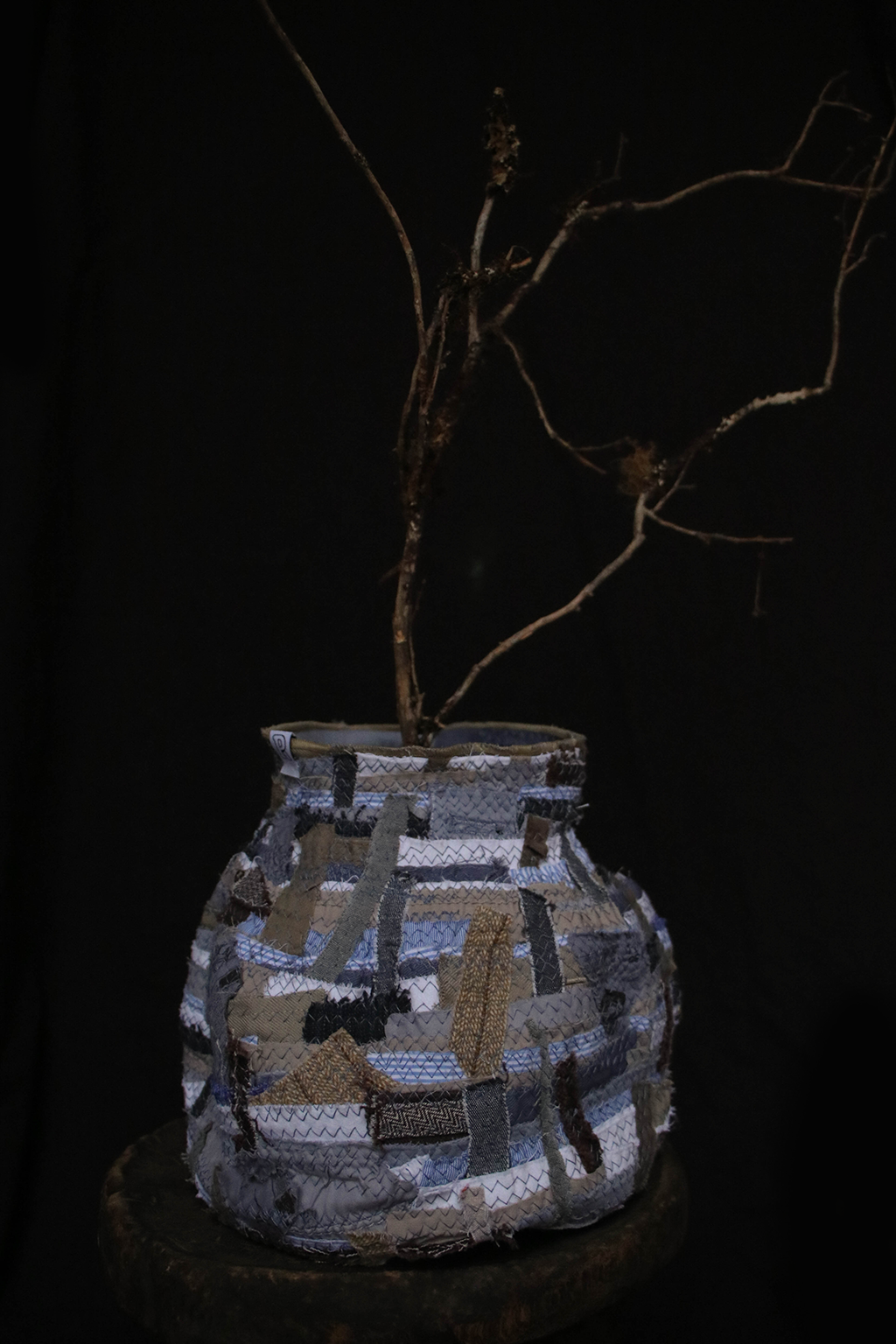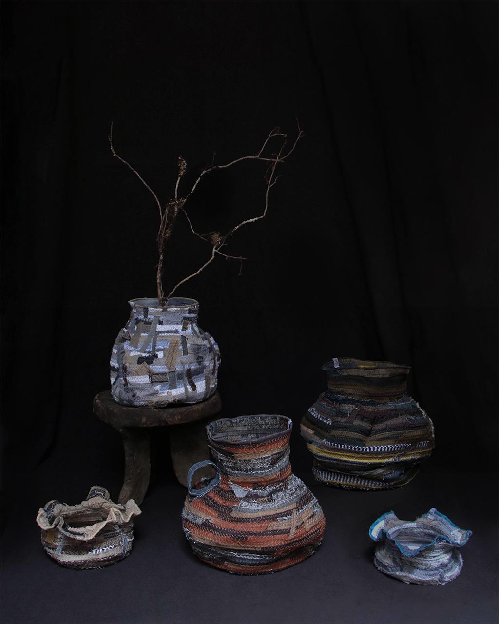 以回收舊衣拆解後的布邊為材料,結合手拉胚概念,創作出如布製陶器般的立體作品,重新賦予廢棄布料新生命。