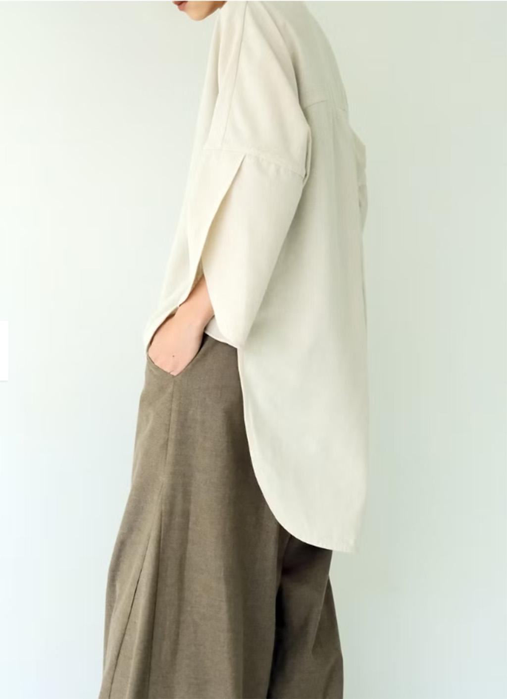 領口、下擺與袖口皆做弧線的剪裁,整體為前短後長的襯衫設計。