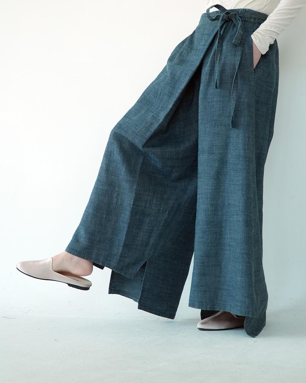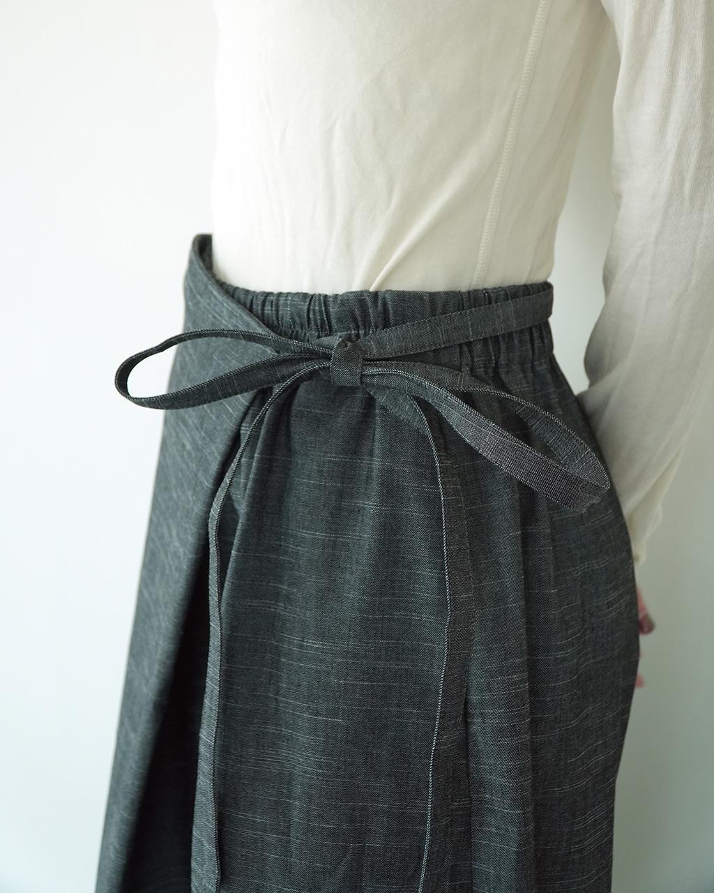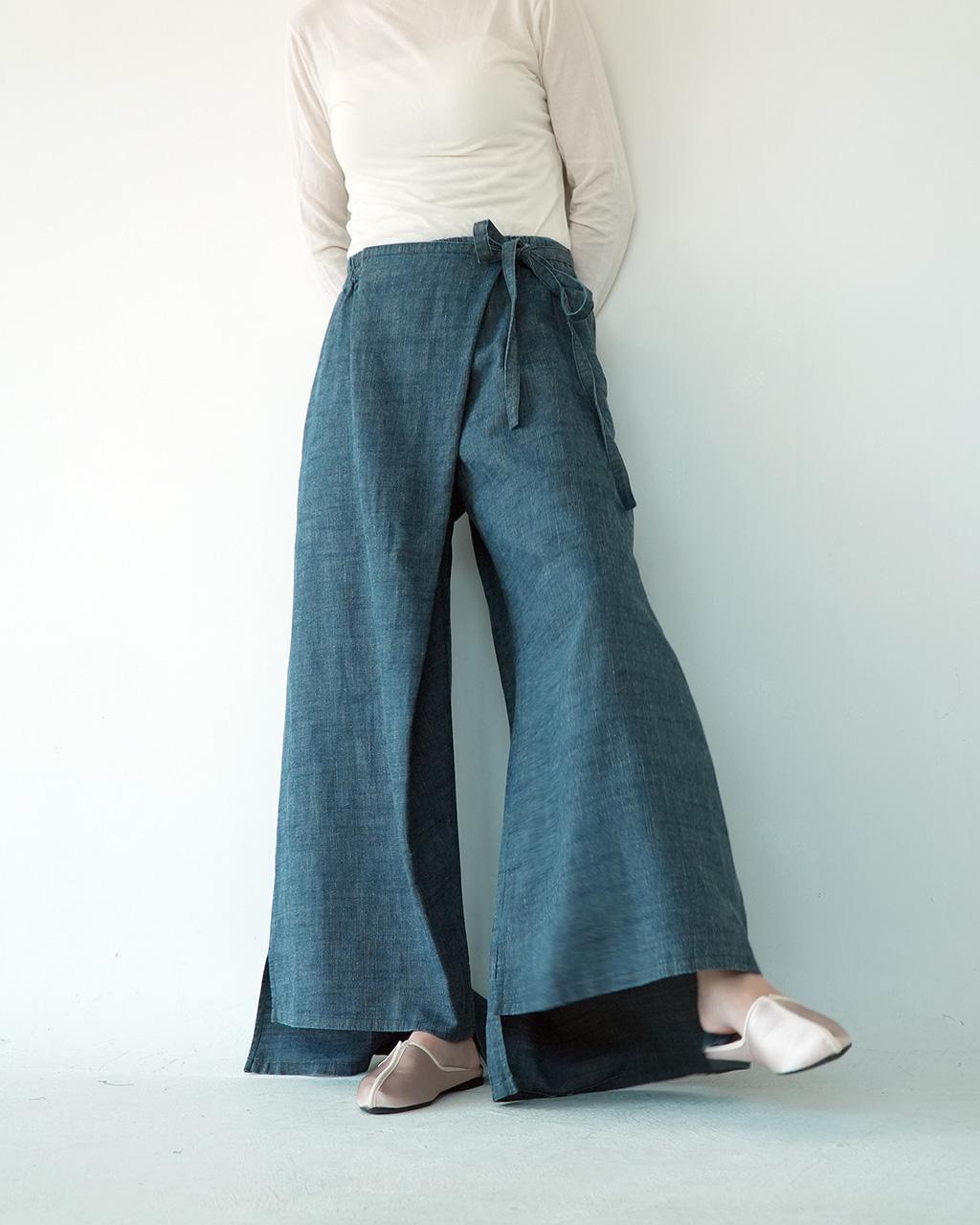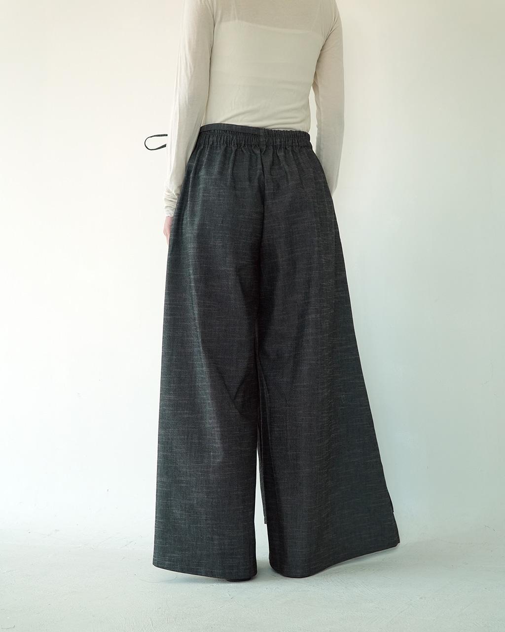 寬版的前片綁帶寬褲,正面看有圍裙感的一片式設計,也讓腰間平順,後方則是鬆緊帶可以輕鬆穿著,