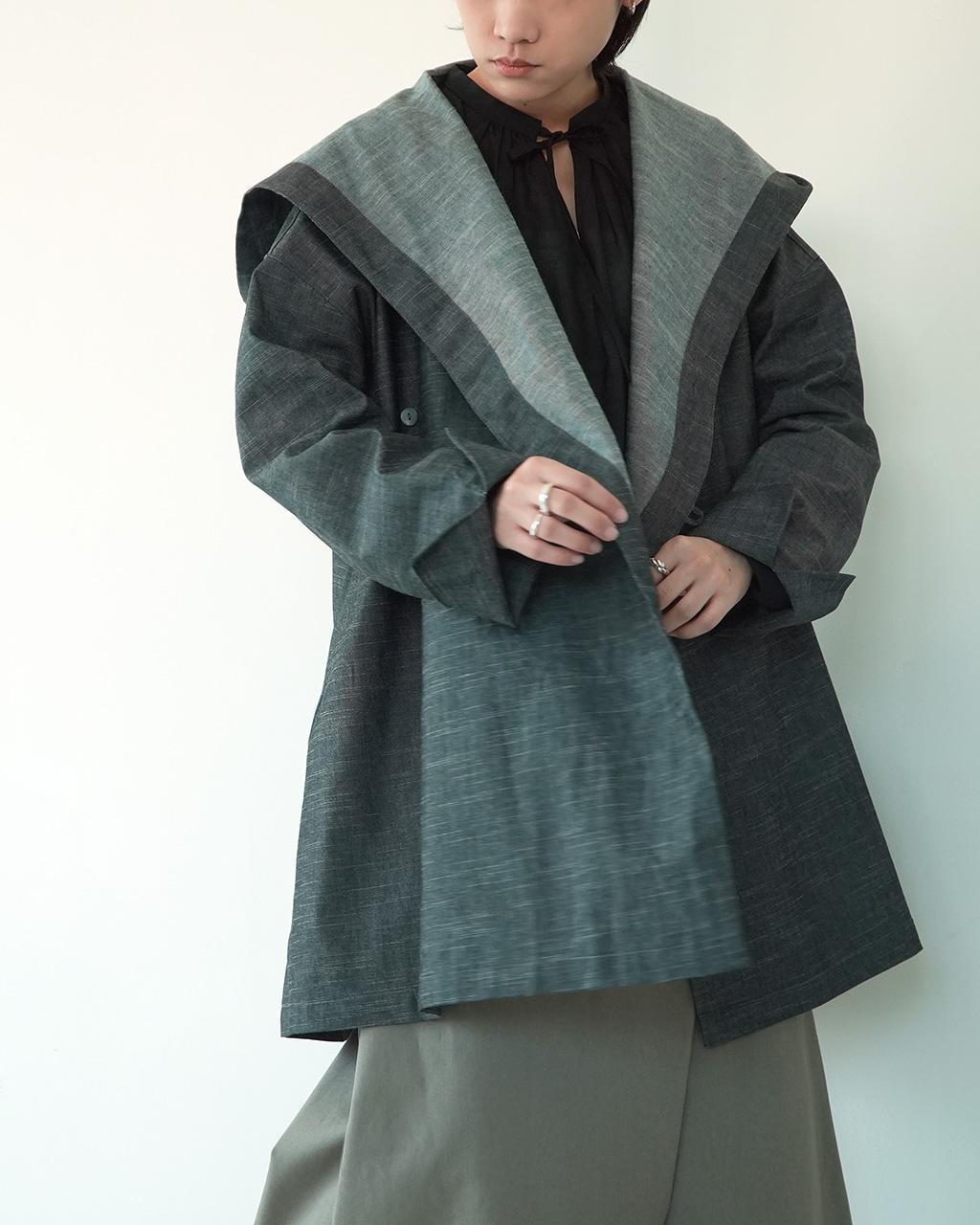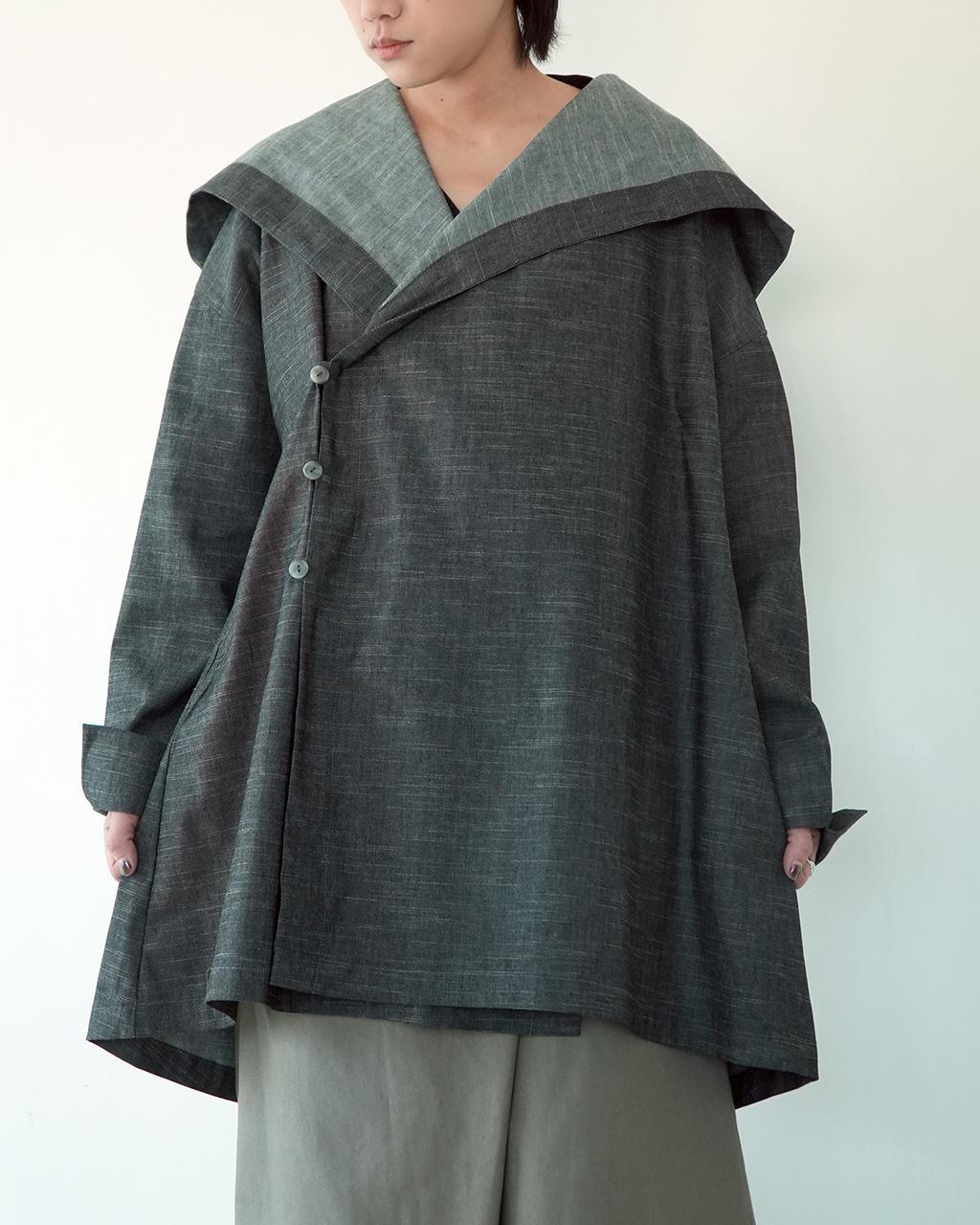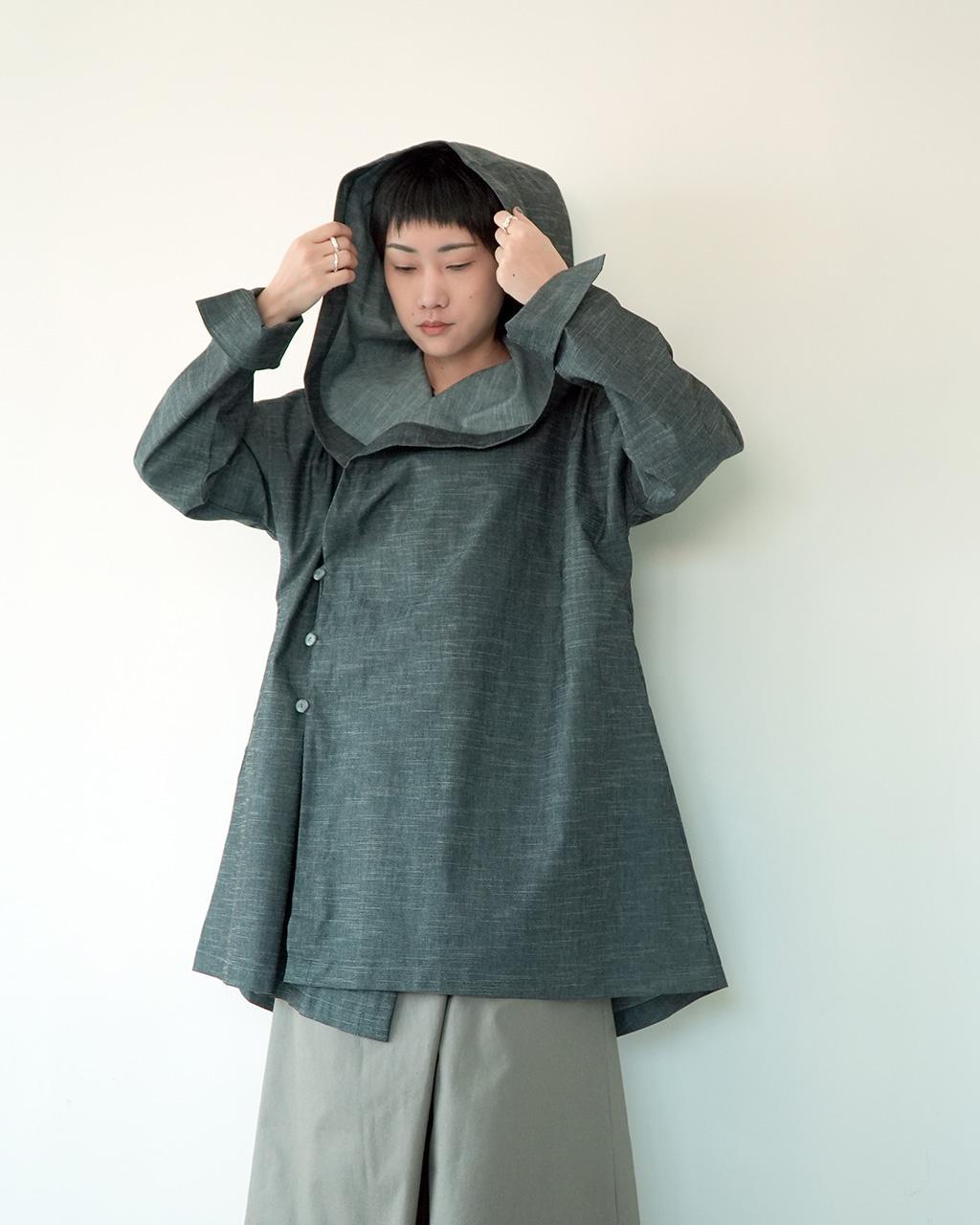 正面為大翻領的休閒輕鬆風衣外套,側面的大連帽有如竹林穿梭僧侶的大袍子般神秘,