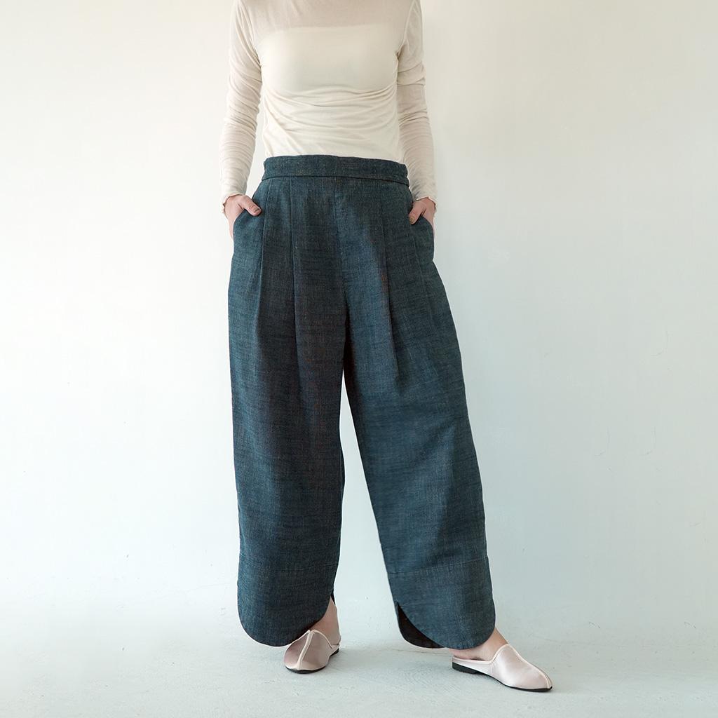 擷取東方下擺弧形的衣著設計與西式西裝褲料的打褶腰頭,