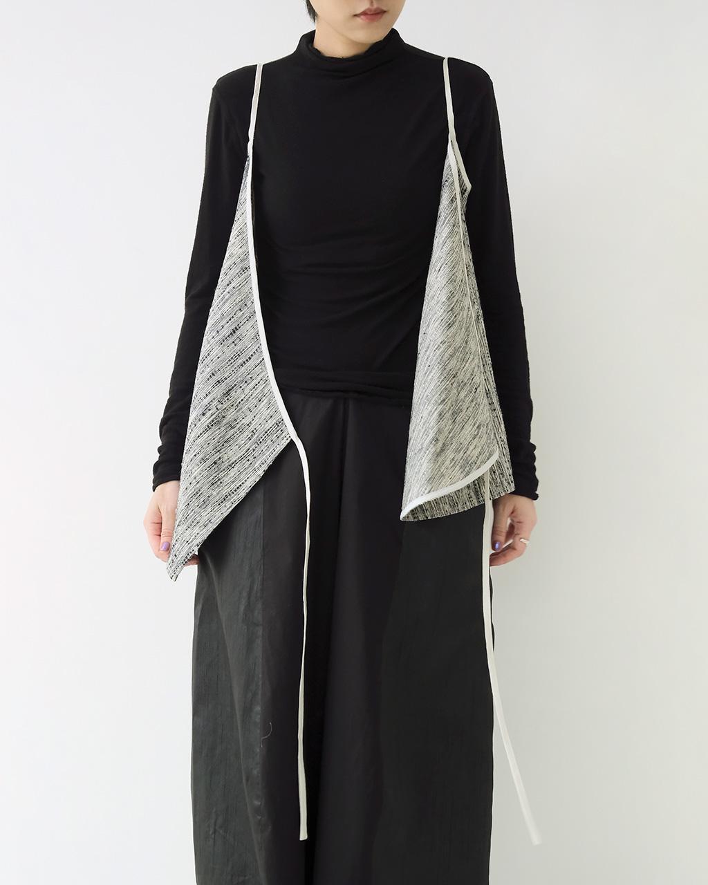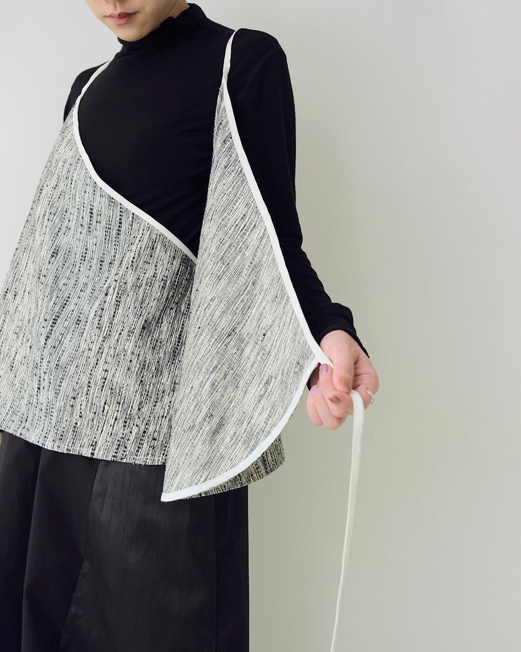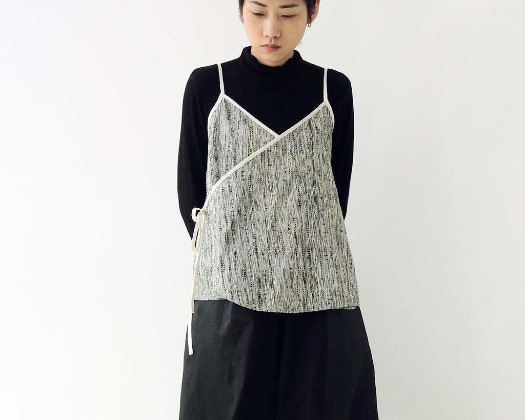 以中式的交襟綁帶為整體結構,雖然是細肩帶的造型但整體布料是屬於紋理明顯的雙色蠶絲紗線交織而成較有厚度的面料,因此讓整體多了一些份量感,適合疊搭於合身衣物的外面,也可以在夏季單穿。