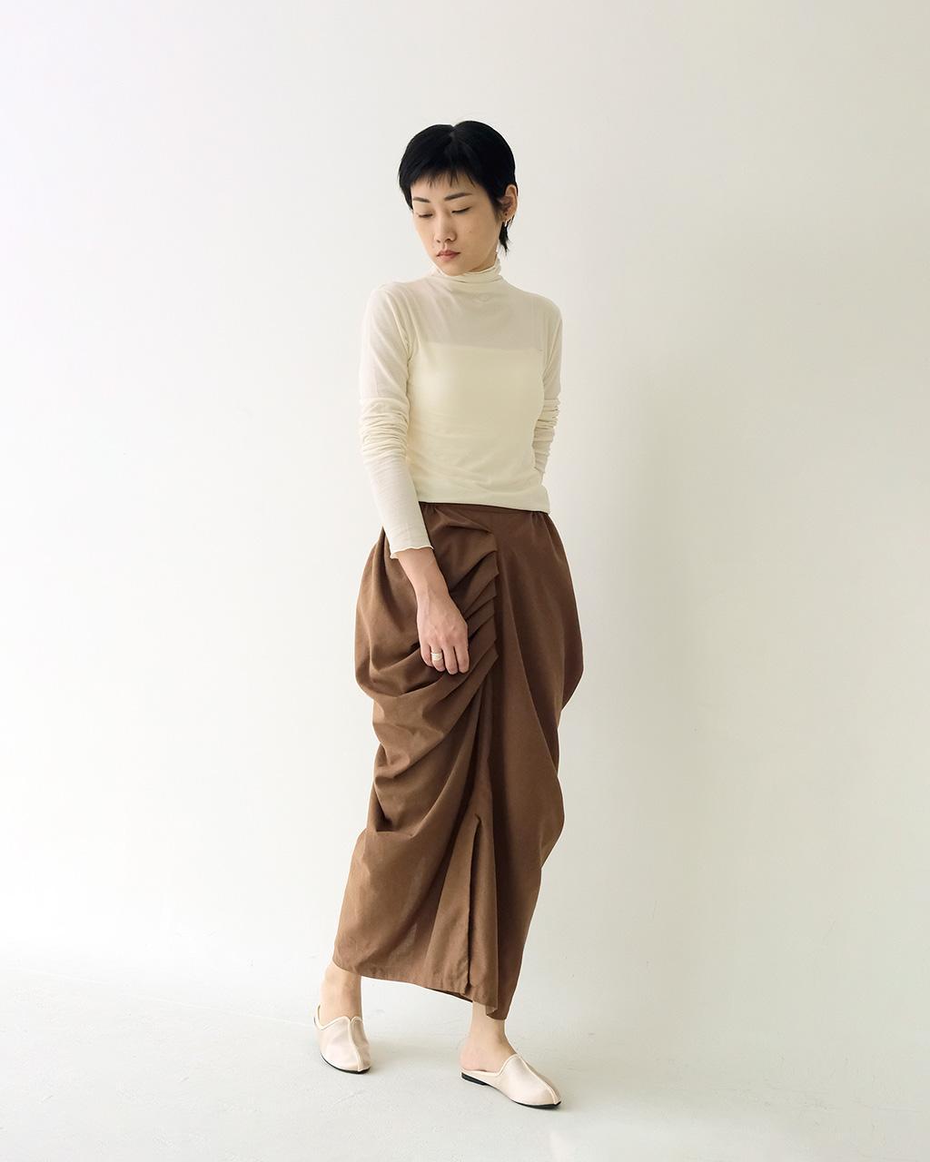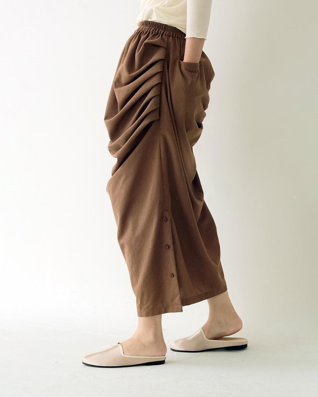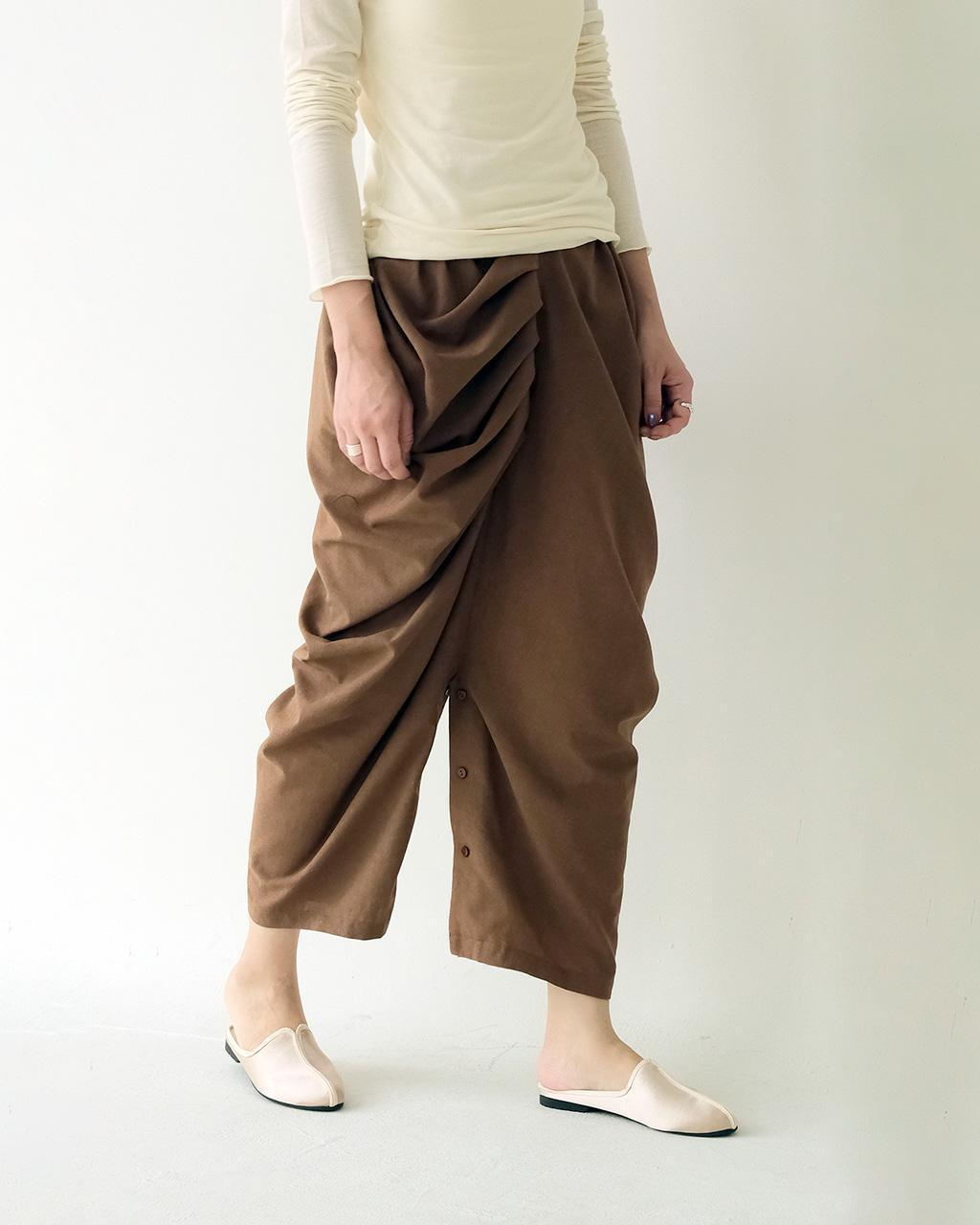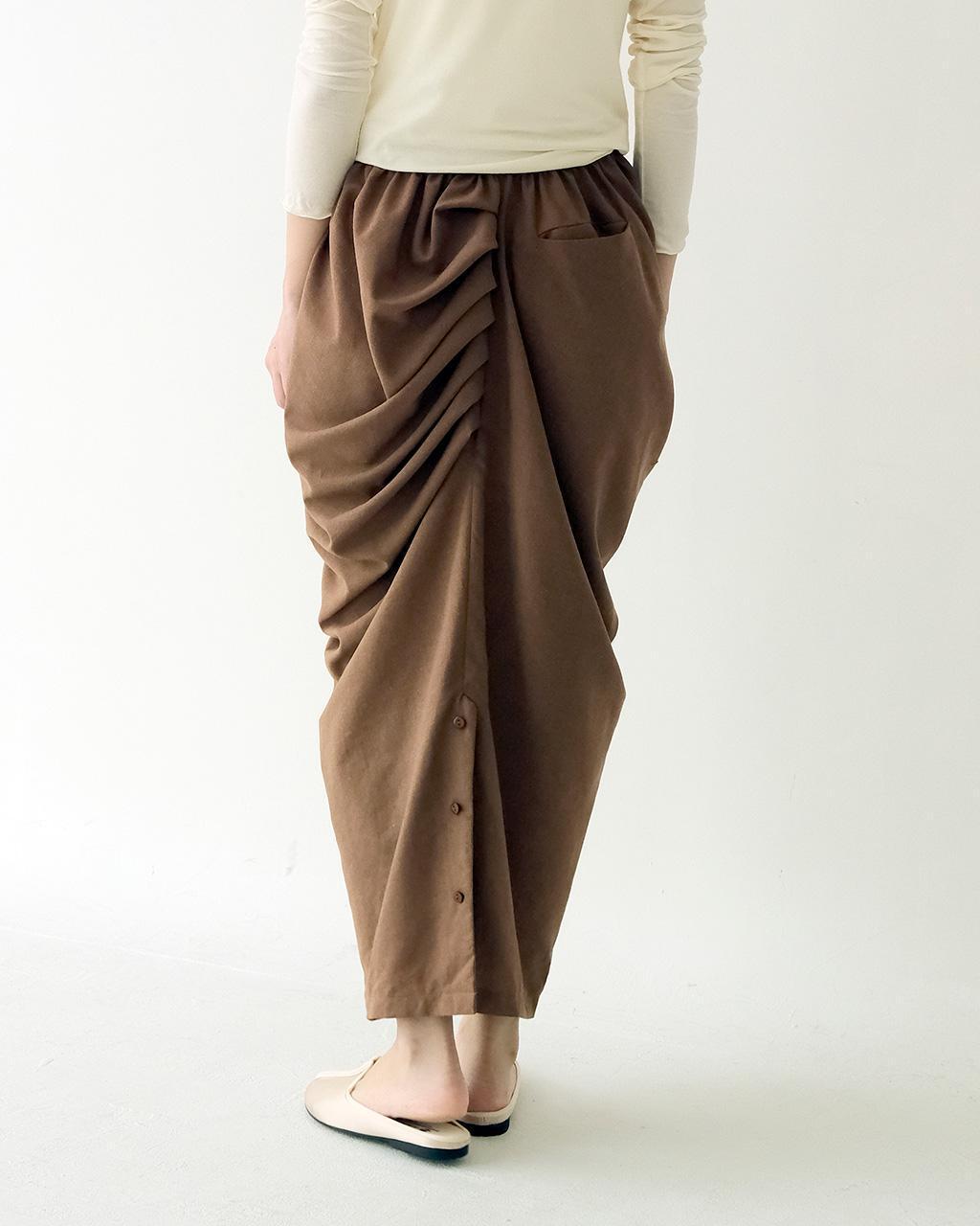 版型靈感來自於印度街邊庶民男性的長巾繞成的下身,隨意帶些垂墜的層次。這件設計成每一面都能穿著的樣子,因為左右不規則的關係沒有正反面之分,可以依照不同上身做變化。下擺開岔處的扣子也能將裙身轉變為褲裝穿著。